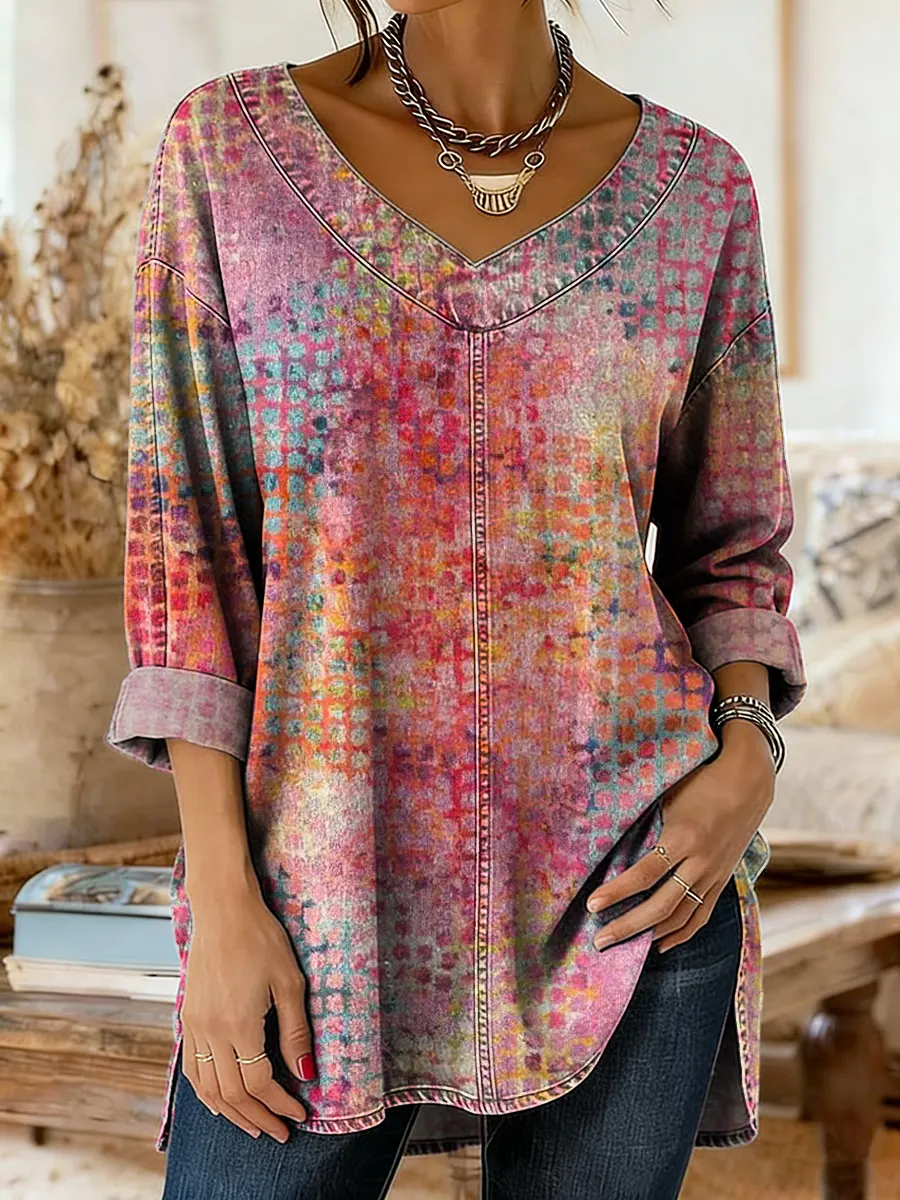 Women's Art-printed Casual Washed Denim Cotton Shirt With Multicolored Gradient Pattern