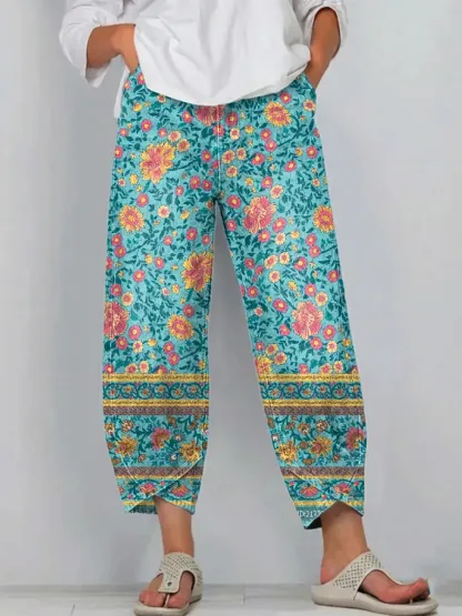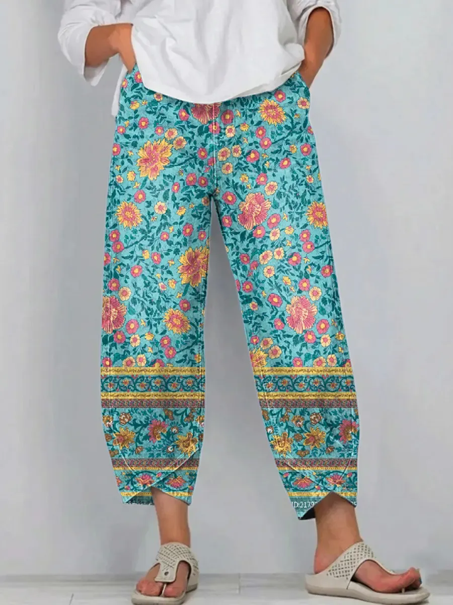 Women's Bohemian Floral Patchwork Art Print Pocket Cotton Jeans