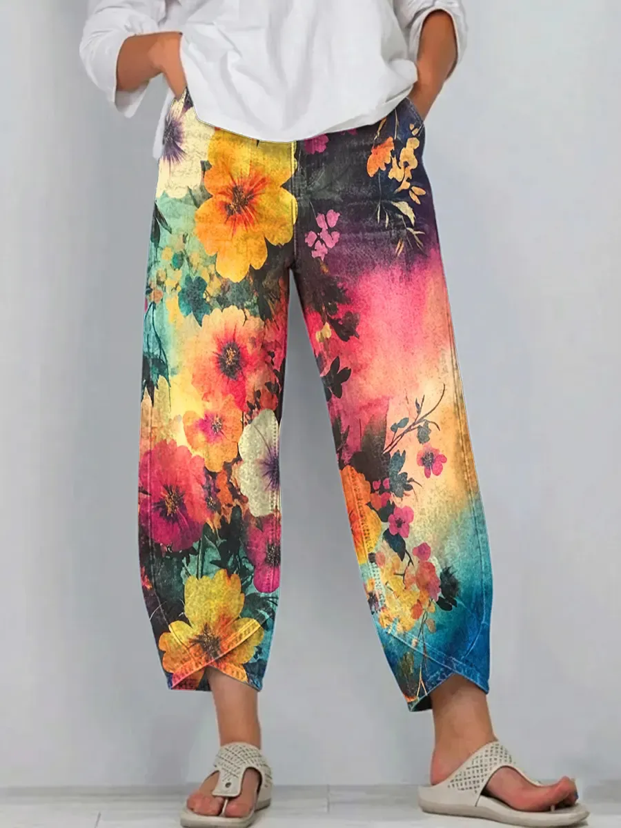 Women's Bohemian Floral Tie-Dye Art Print Pocket Cotton Jeans