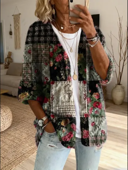 Women's Bohemian Patchwork Floral Art Print Casual Cardigan Sweater