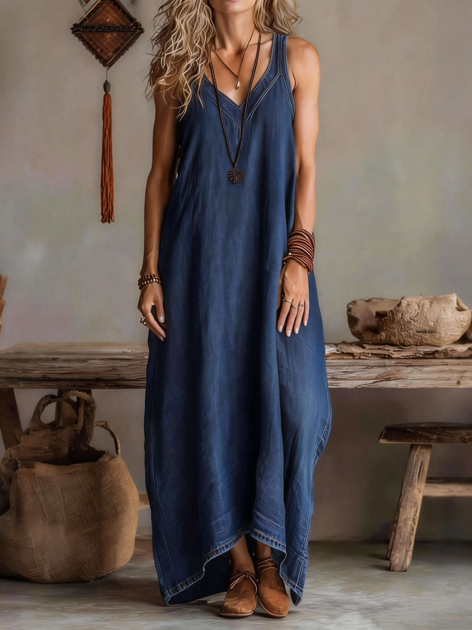 Women's Casual V-neck Washed Cotton Denim Dress