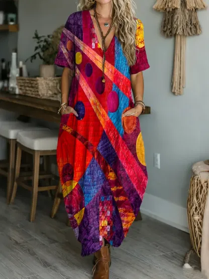 Women's Colorful Abstract Art Print V-neck Short-sleeve Cotton Pocket Dress
