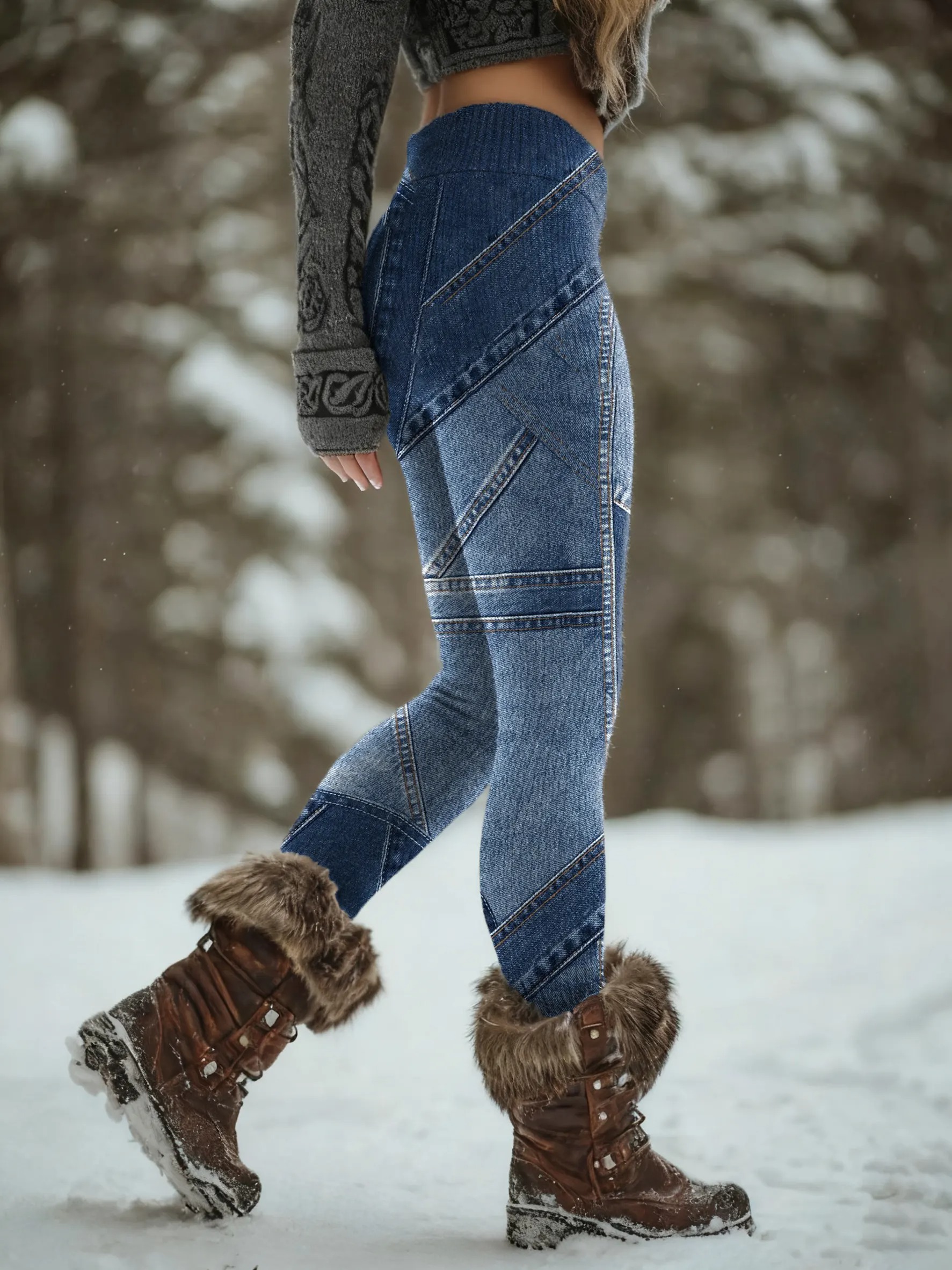 Women's Denim-Print Patchwork Artistic Print Pocket Cotton Dress
