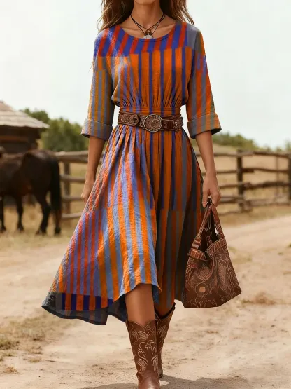 Women's Ethnic Colorful Line Art Print Round Neck Cotton Linen Pocket Dress