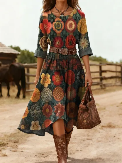 Women's Ethnic Floral Art Print Round Neck Cotton Linen Pocket Dress
