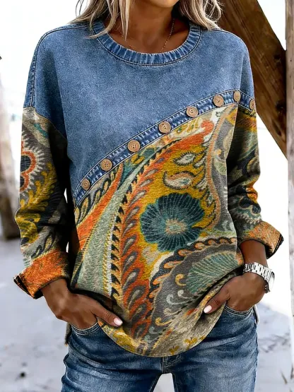 Women's Ethnic Floral Paisley Art Print Crew Neck Denim Button Patchwork Sweatshirt