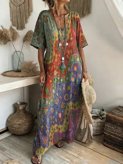 Women's Ethnic Floral Wave Collage Art Print V-neck Short-sleeve Cotton Pocket Dress