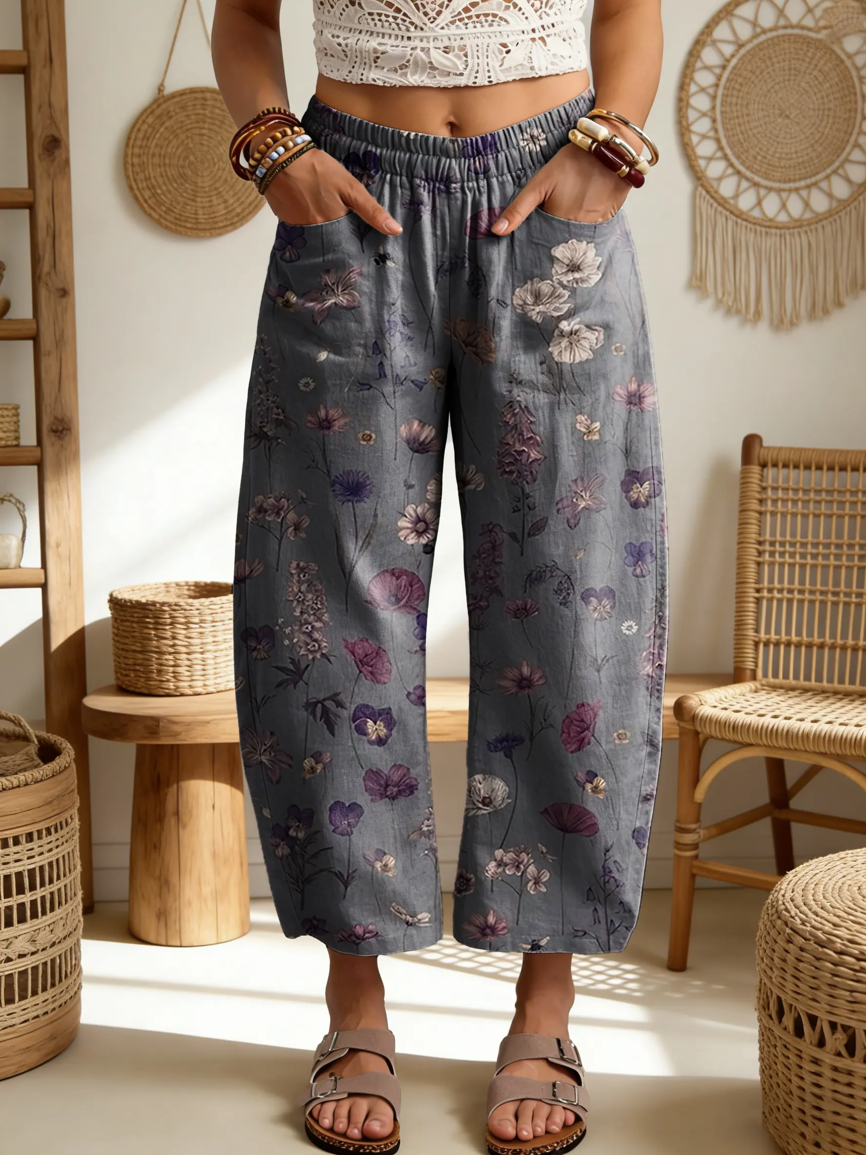 Women's Floral Art Print Elastic Waist Pocket Cotton Pants