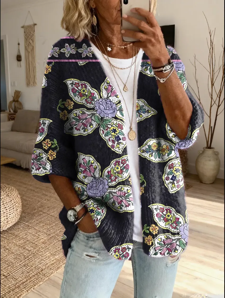 Women's Hippie Retro Floral Art Print Casual Cardigan Sweater
