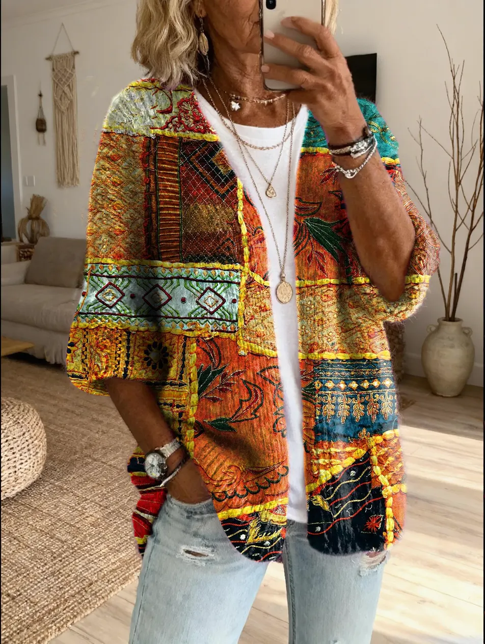 Women's Hippie Retro Patchwork Artistic Print Casual Cardigan Sweater