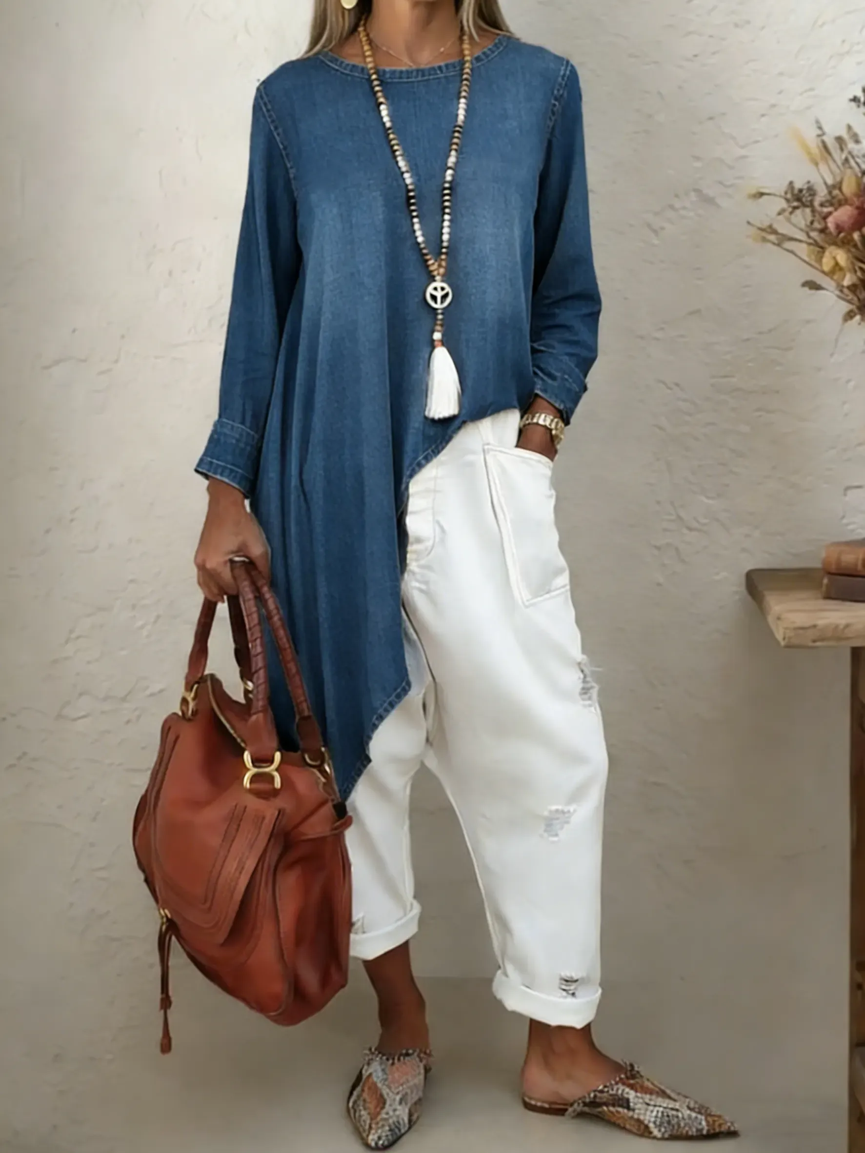 Women's Irregular Hem Long-sleeve Denim Top