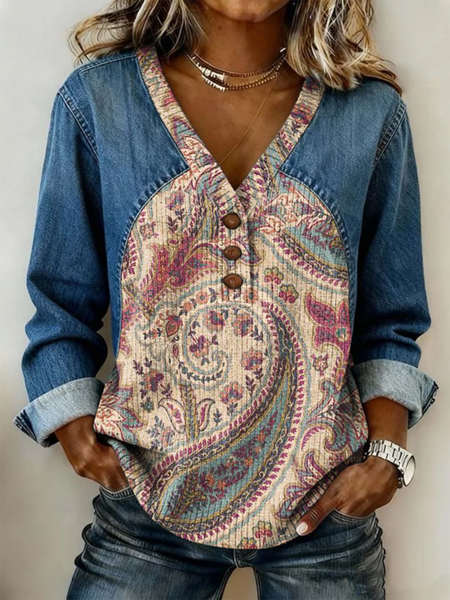 Women's Retro Bohemian Art Print Casual Long-Sleeve V-Neck Washed Cotton Denim and Knitwear Combination T-Shirt
