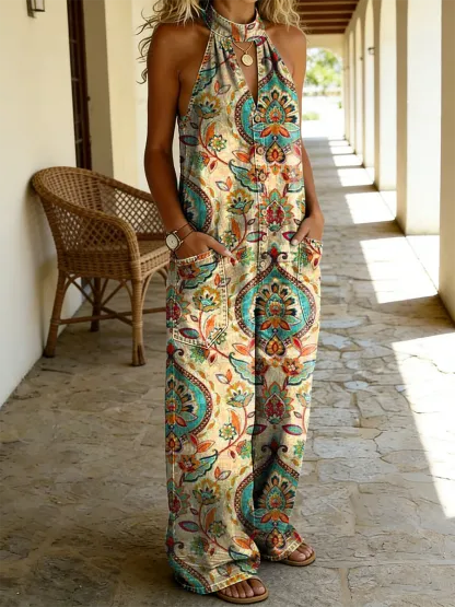 Women's Retro Bohemian Ethnic Floral Art Print Casual Sleeveless Pocket Jumpsuit