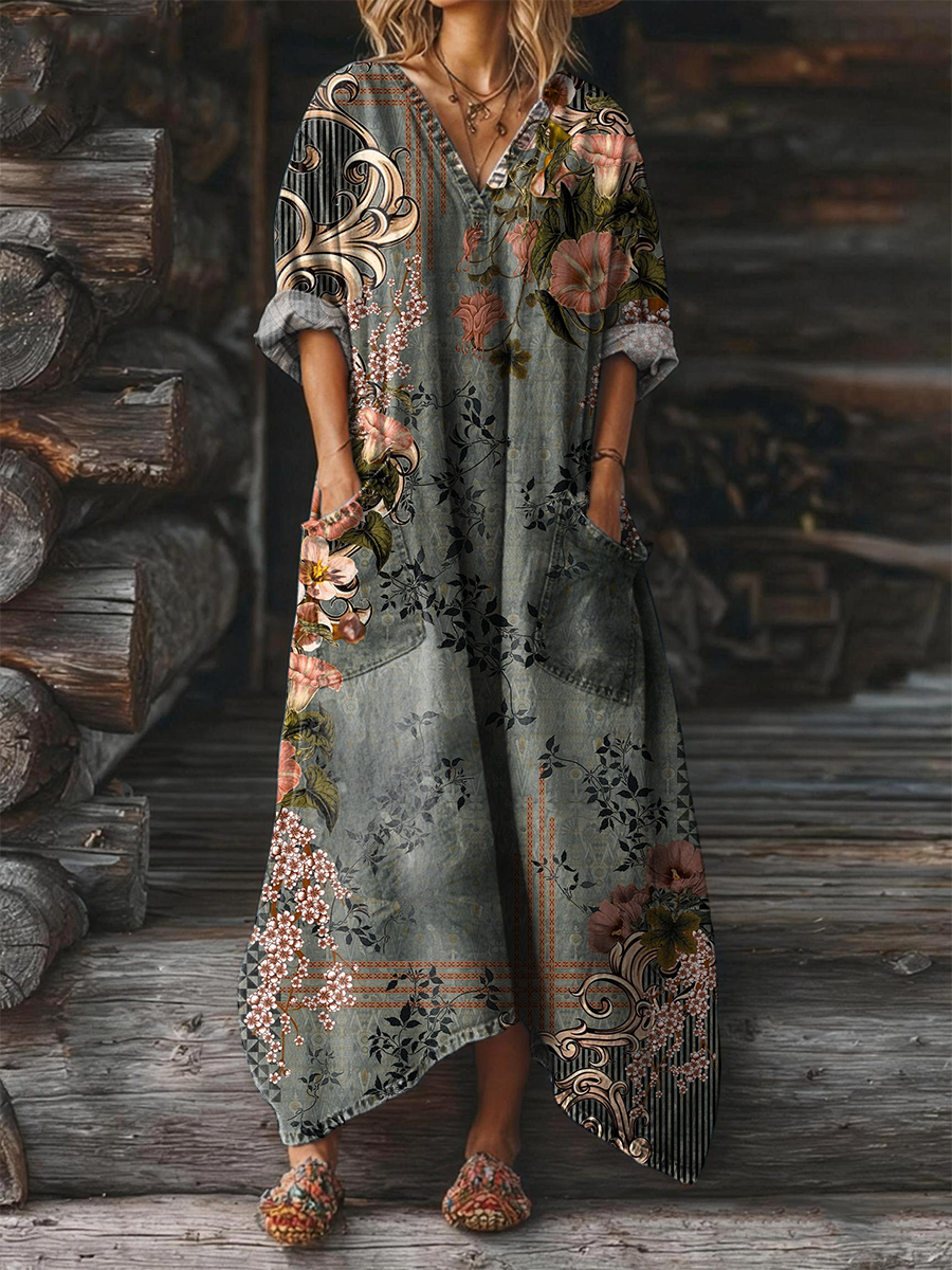 Women's Retro Bohemian Floral Art Print Casual Long-Sleeve V-Neck Pocket Washed Cotton Denim Dress