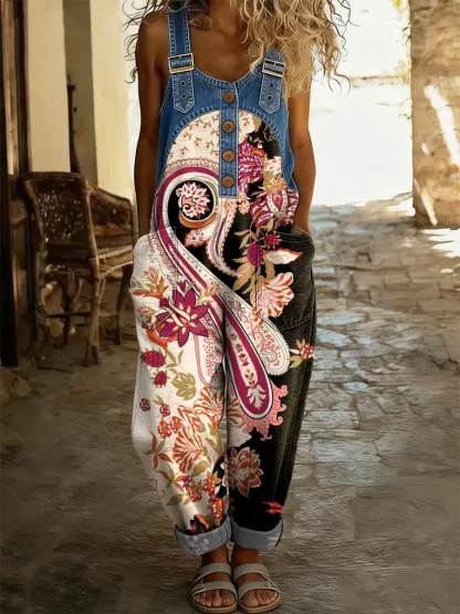 Women's Retro Color Block Bohemian Floral Art Print Casual Denim Patchwork Jumpsuit