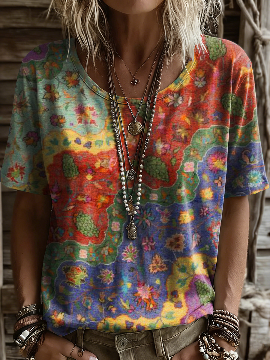 Women's Retro Colorful Ethnic Floral Wave Art Print Casual Short Sleeve Crew Neck T-shirt