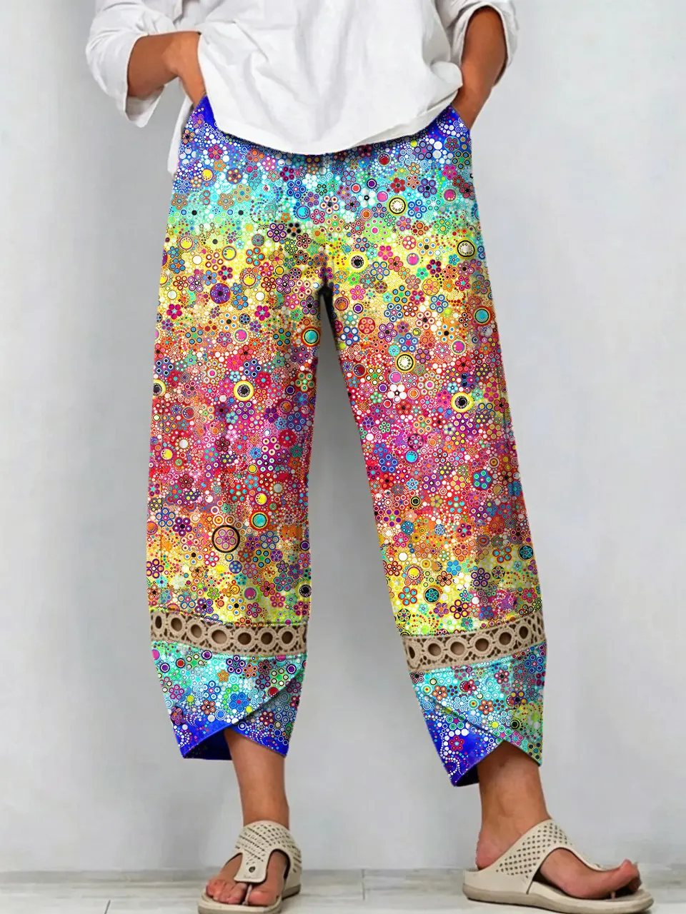Women's Retro Colorful Gradient Petal Art Print Washed Cotton Denim Cutout Pants