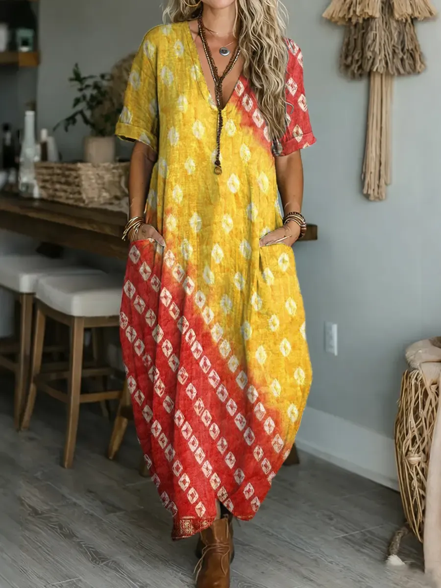 Women's Retro Ethnic Art Pattern Print V-neck Short-sleeve Cotton Pocket Dress
