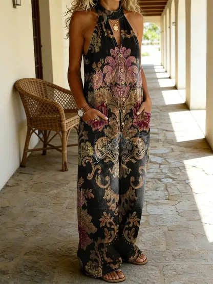 Women's Retro Ethnic Floral Art Print Casual Sleeveless Pocket Jumpsuit