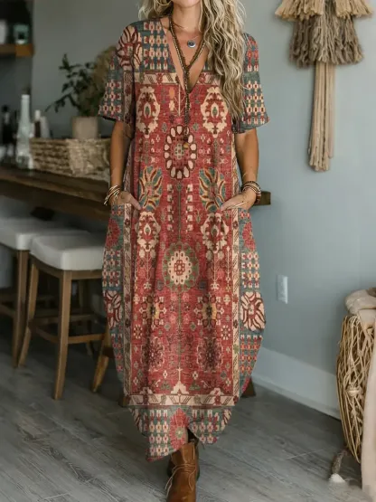 Women's Retro Ethnic Totem Art Pattern Print V-neck Short-sleeve Cotton Pocket Dress