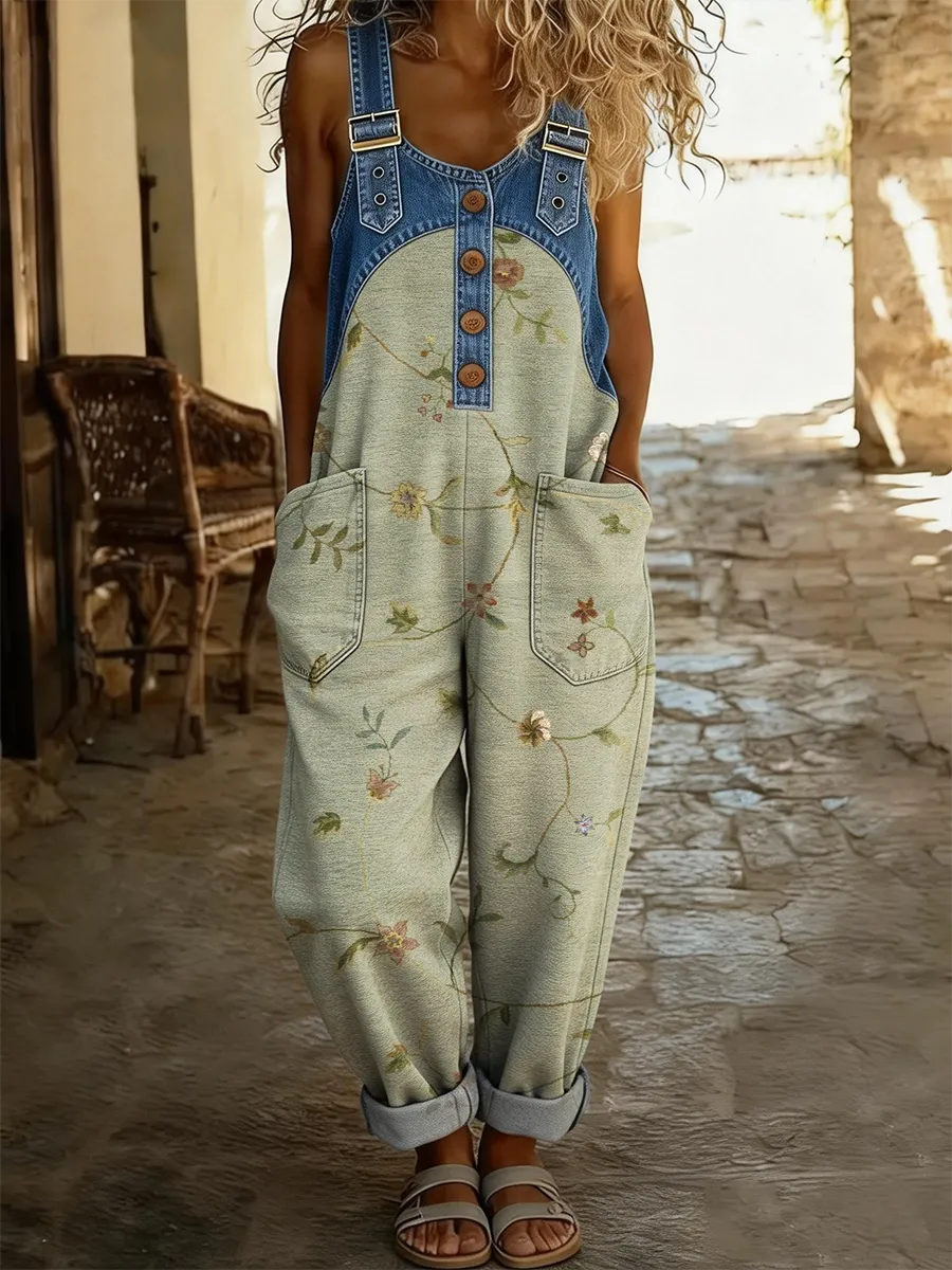 Women's Retro Floral Art Print Casual Denim Patchwork Jumpsuit