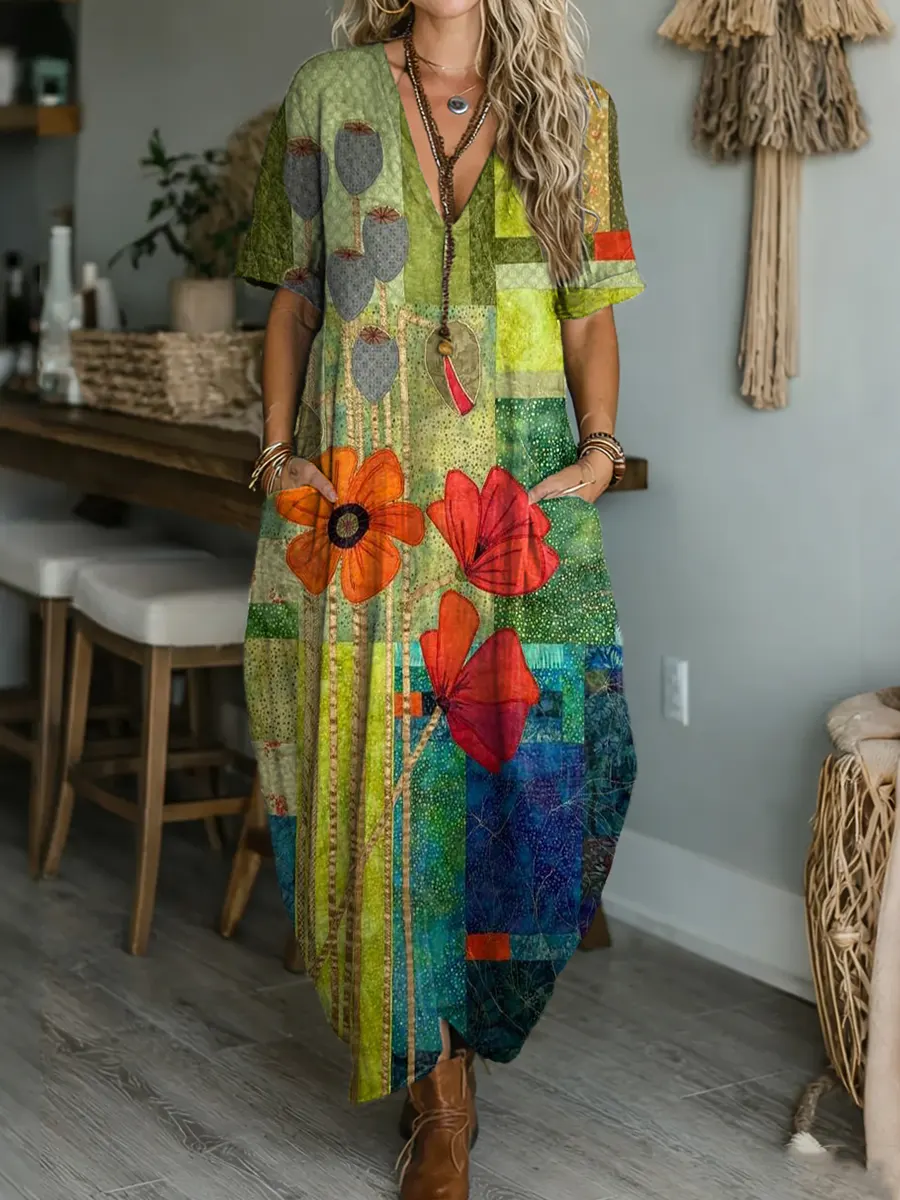 Women's Retro Floral Art Print V-neck Short-sleeve Cotton Pocket Dress