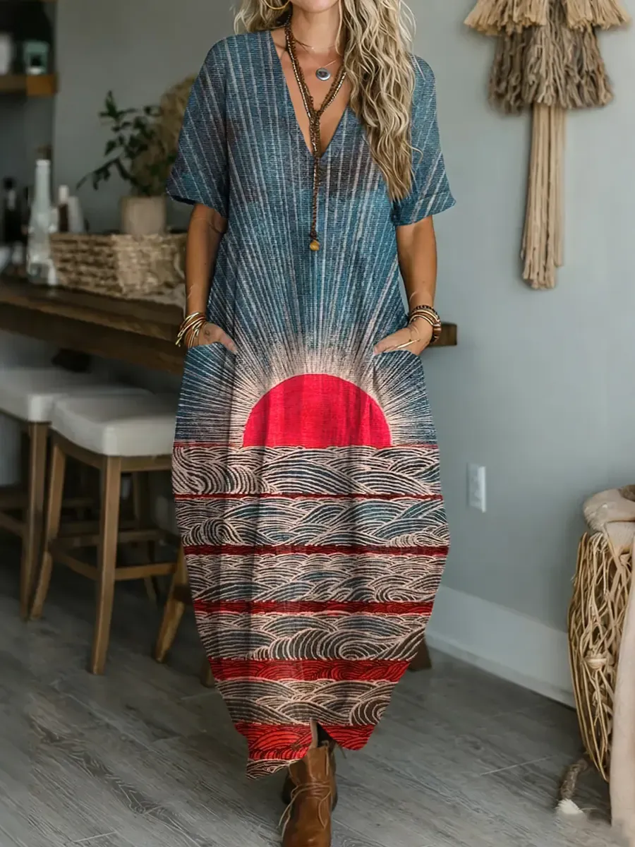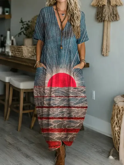Women's Retro Sun Art Print V-neck Short-sleeve Cotton Pocket Dress