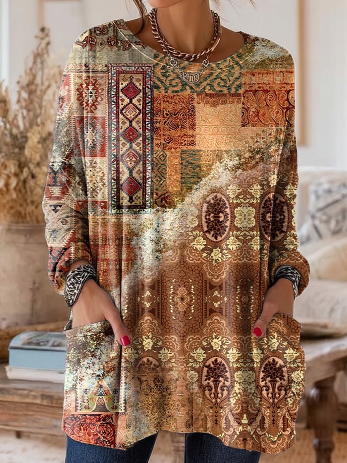 Women's Vintage Bohemian Art Print Casual Long-Sleeve V-Neck Cotton Dress