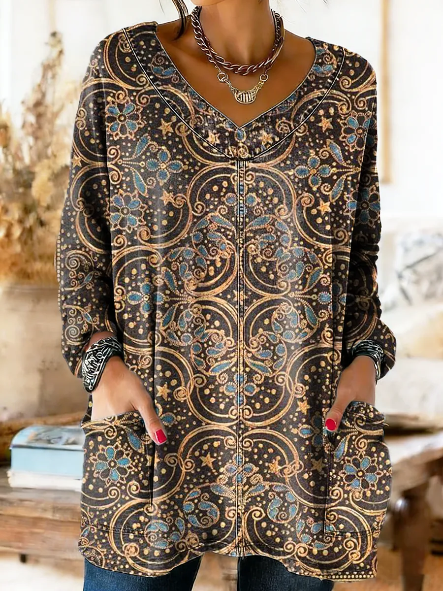 Women's Vintage Ethnic Black Floral Art Print Casual V-neck Pocket Long Sleeve Washed Denim Shirt