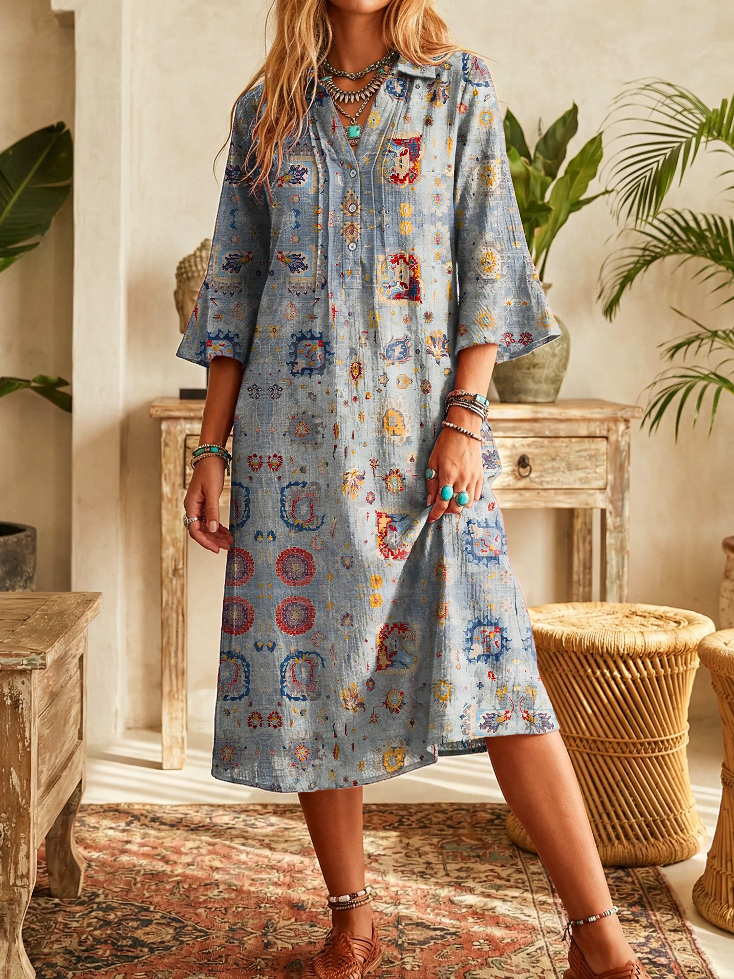 Women's Vintage Ethnic Gray Patterned Art Printed Casual Flap Buttoned Shirt Dresses