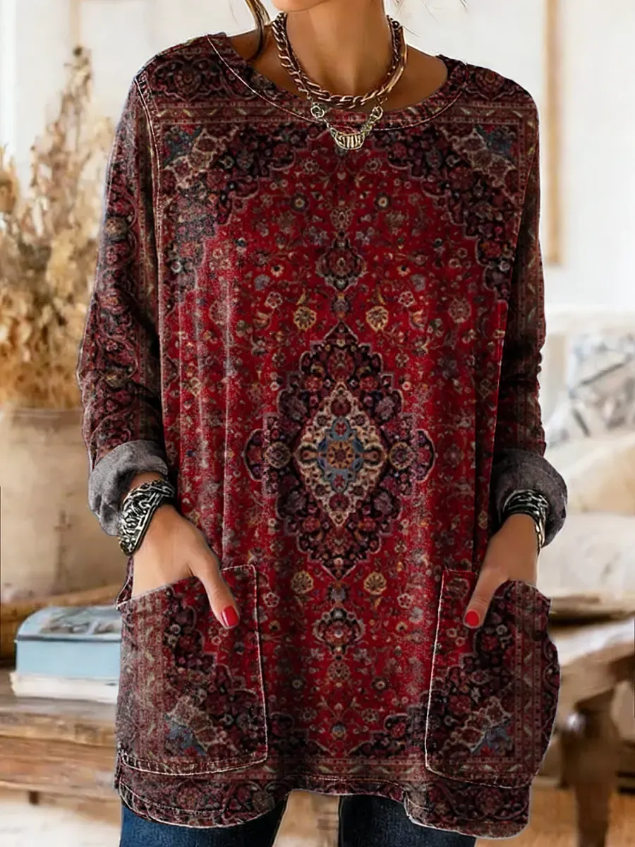 Women's Vintage Ethnic Pattern Art Print Casual Long-sleeve Crew Neck Pocket Cotton Denim T-shirt