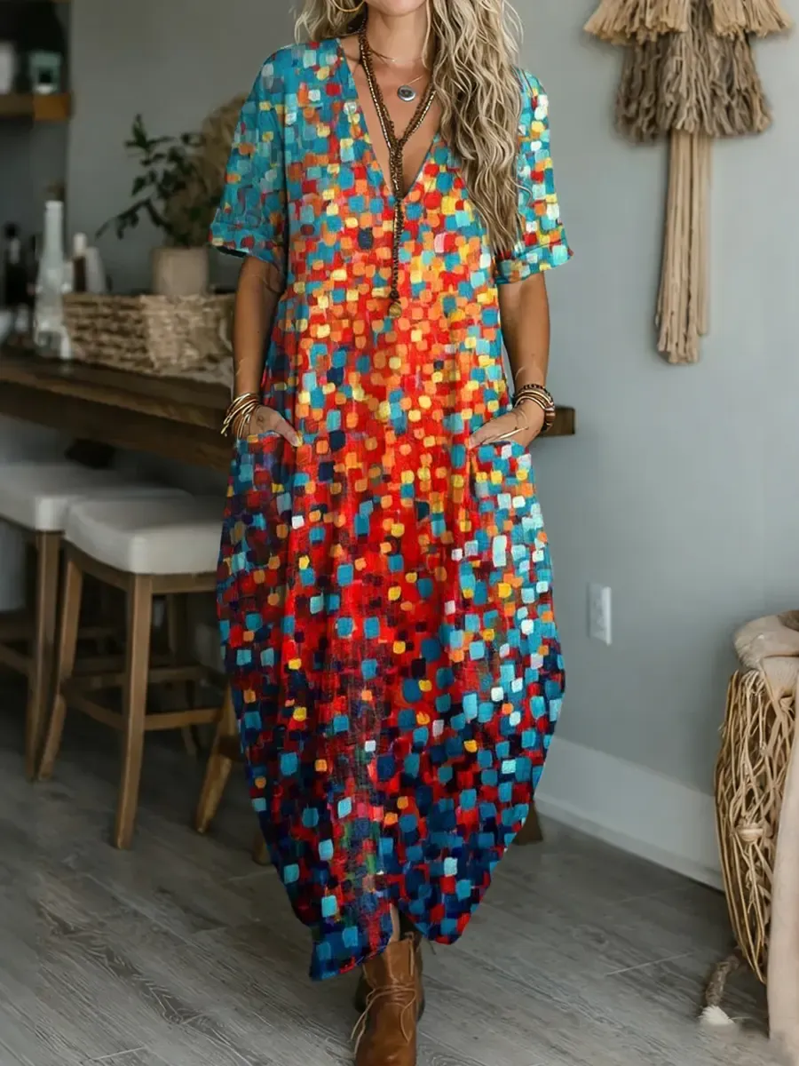 Women's Women's Colorful Abstract Art Print V-neck Short-sleeve Cotton Pocket Dress