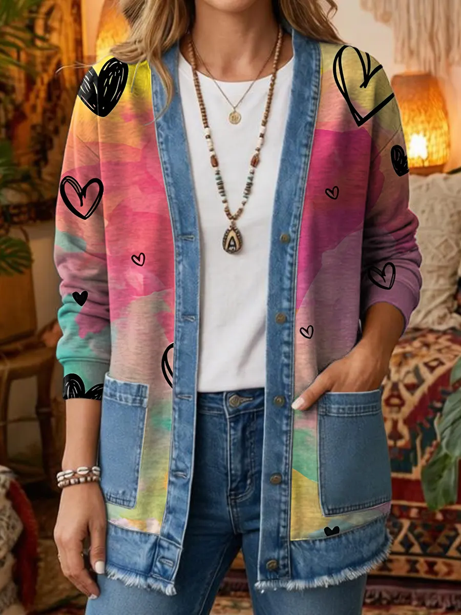 Ethnicity Colorful Love Women's Art Print Casual Pocket Denim Patchwork Shirt Coat