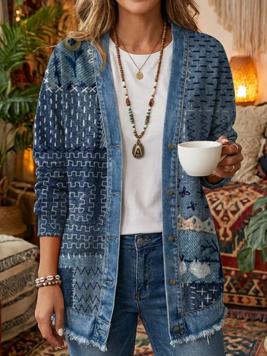 Ethnicity Patchwork Texture Women's Art Print Casual Long Sleeve Denim Patchwork Shirt Coat