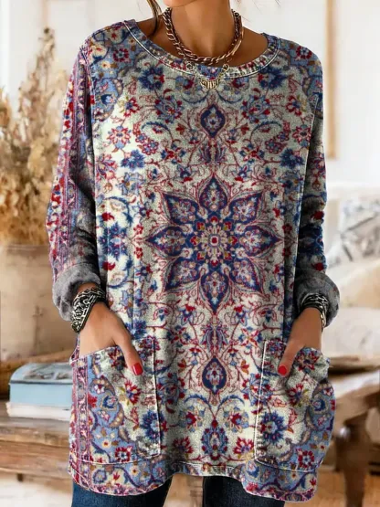Ethnicity Totem Geometry Purple Women's Casual Long-sleeve Crew Neck Pocket Washed Cotton Denim T-shirt