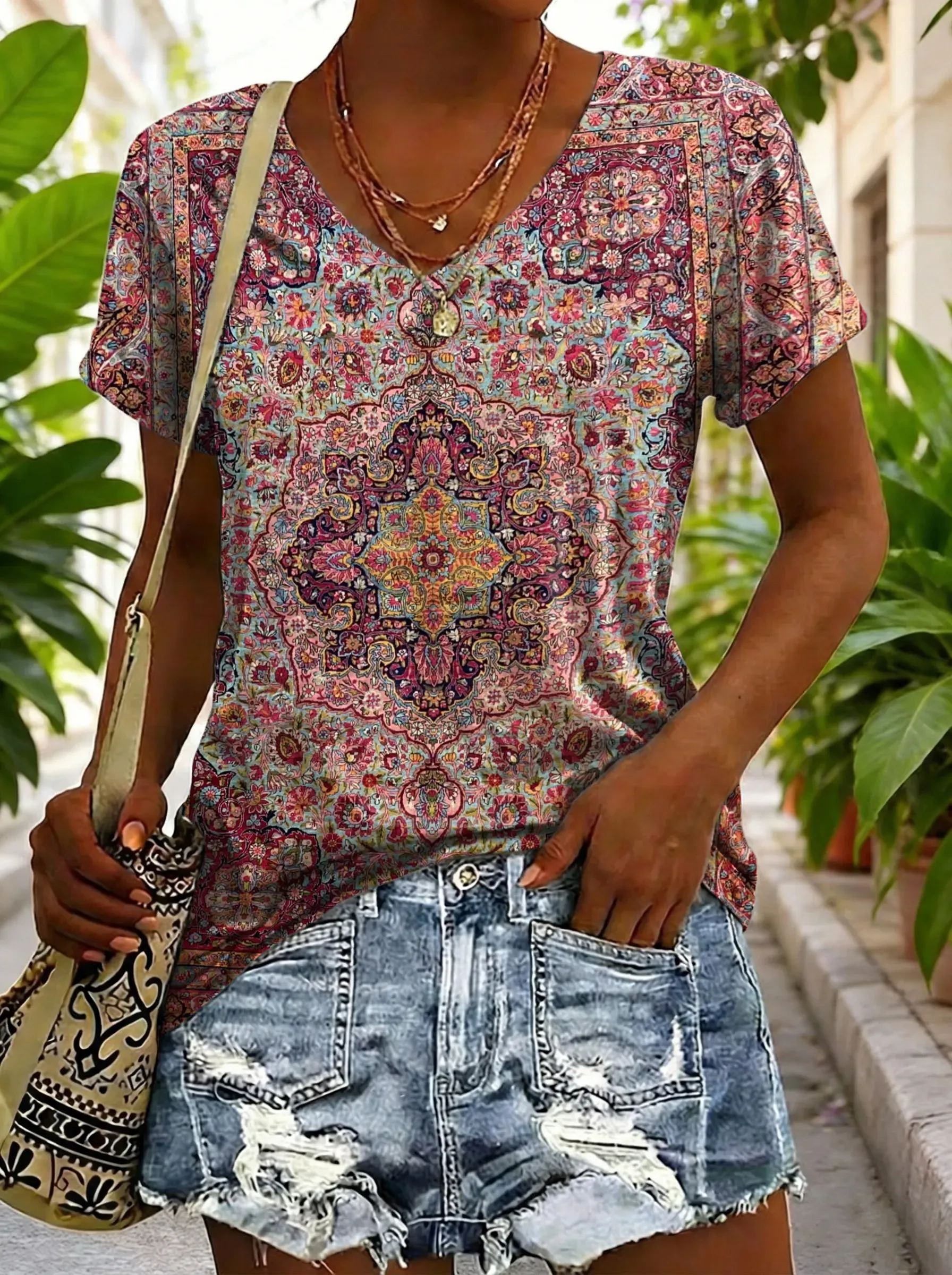Ethnicity Totem Geometry Women's V-neck Print Casual T-shirt
