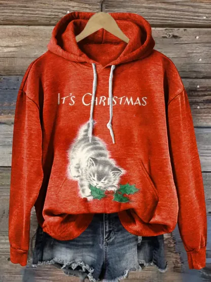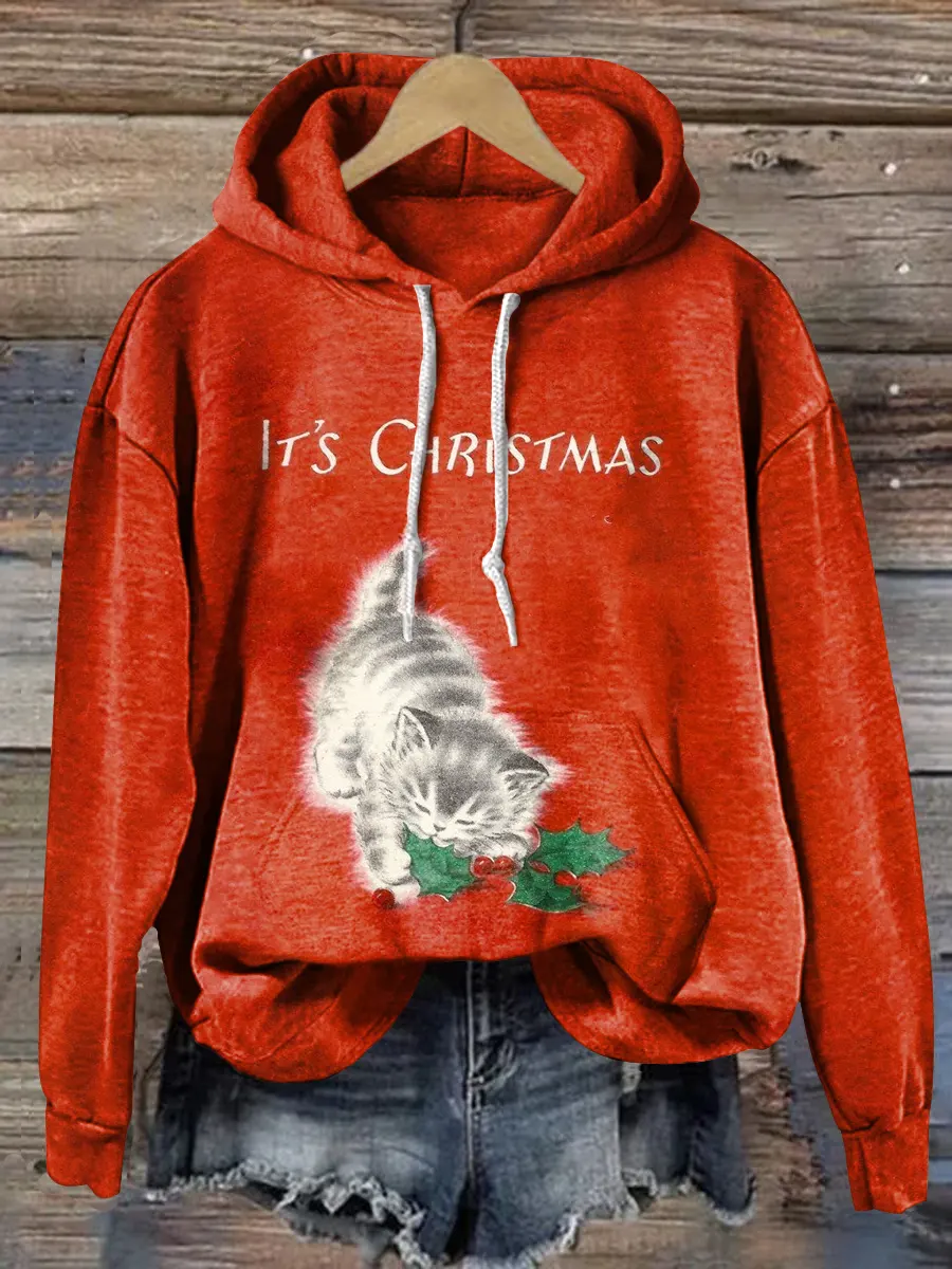 Retro Christmas Cat Print Casual Hoodie Sweatshirt