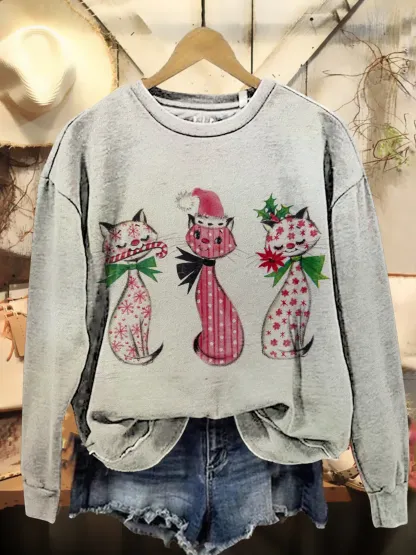 Retro Christmas Cats Print Casual Sweatshirt