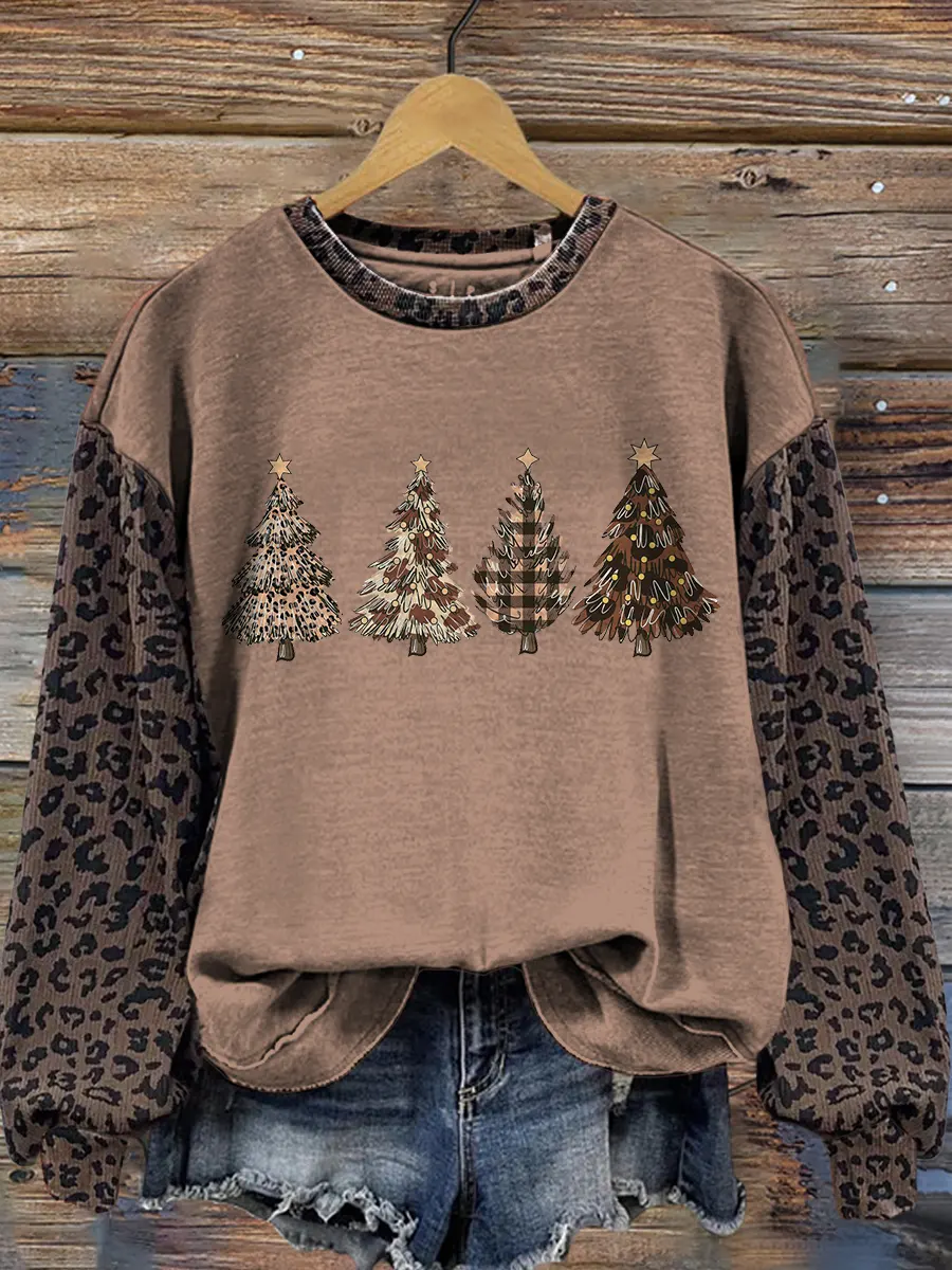 Retro Christmas Tree Leopard Print Casual Sweatshirt