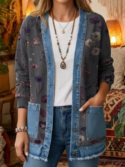 Vintage Ethnicity Flower Purple Women's Art Print Casual Pocket Denim Patchwork Shirt Coat