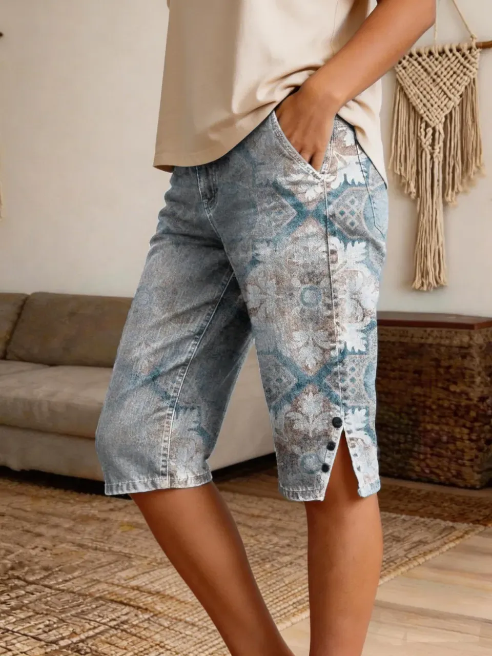 Women's Bohemian Ethnic Floral Art Print Casual Denim Shorts