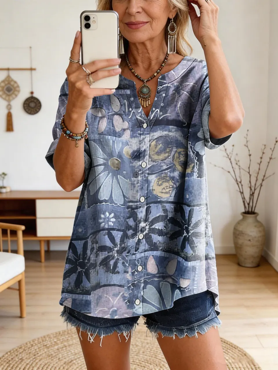 Women's Bohemian Style Floral Art Print Cotton-linen Casual Top