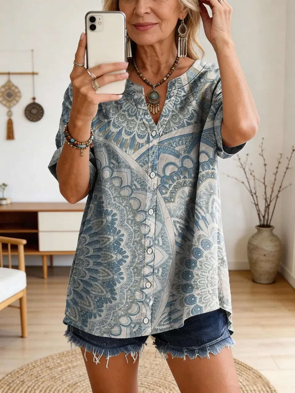 Women's Bohemian Style Floral Totem Art Print Cotton-linen Casual Top