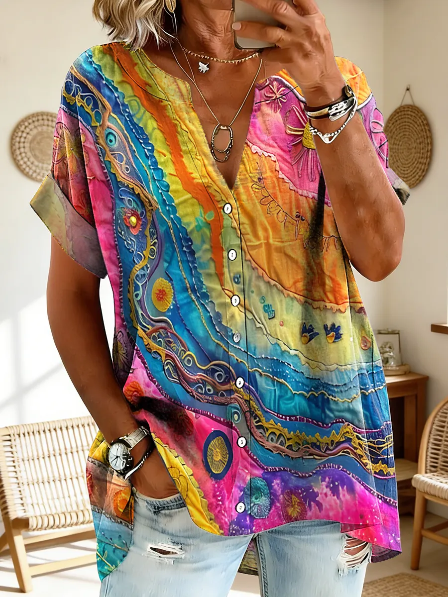 Women's Colorful Liquid Art Print Buttoned Cotton Pocket Dress