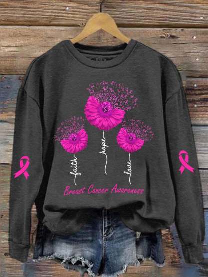 Women's Faith Hope Love Breast Cancer Awareness Daisy Print Crew Neck Sweatshirt