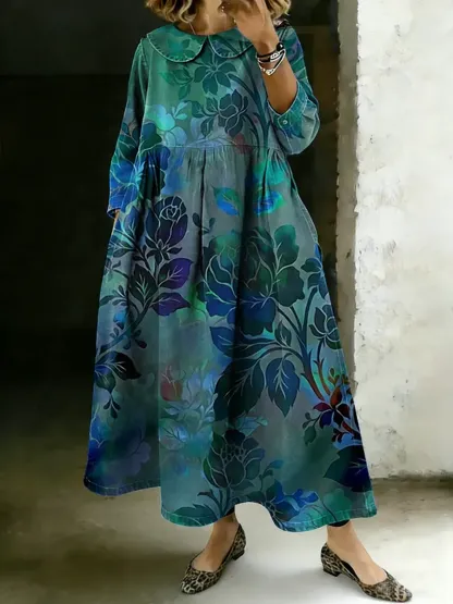 Women's Floral Print Peter Pan Collar Long Sleeve Loose Denim Dress