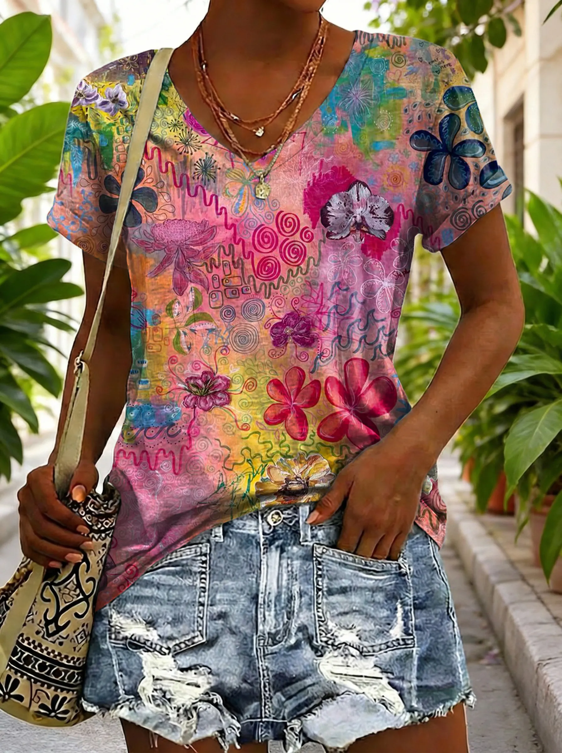 Women's Hippie Colorful Oil Painting Floral Art Print Casual Short-sleeve V-neck Cotton T-shirt
