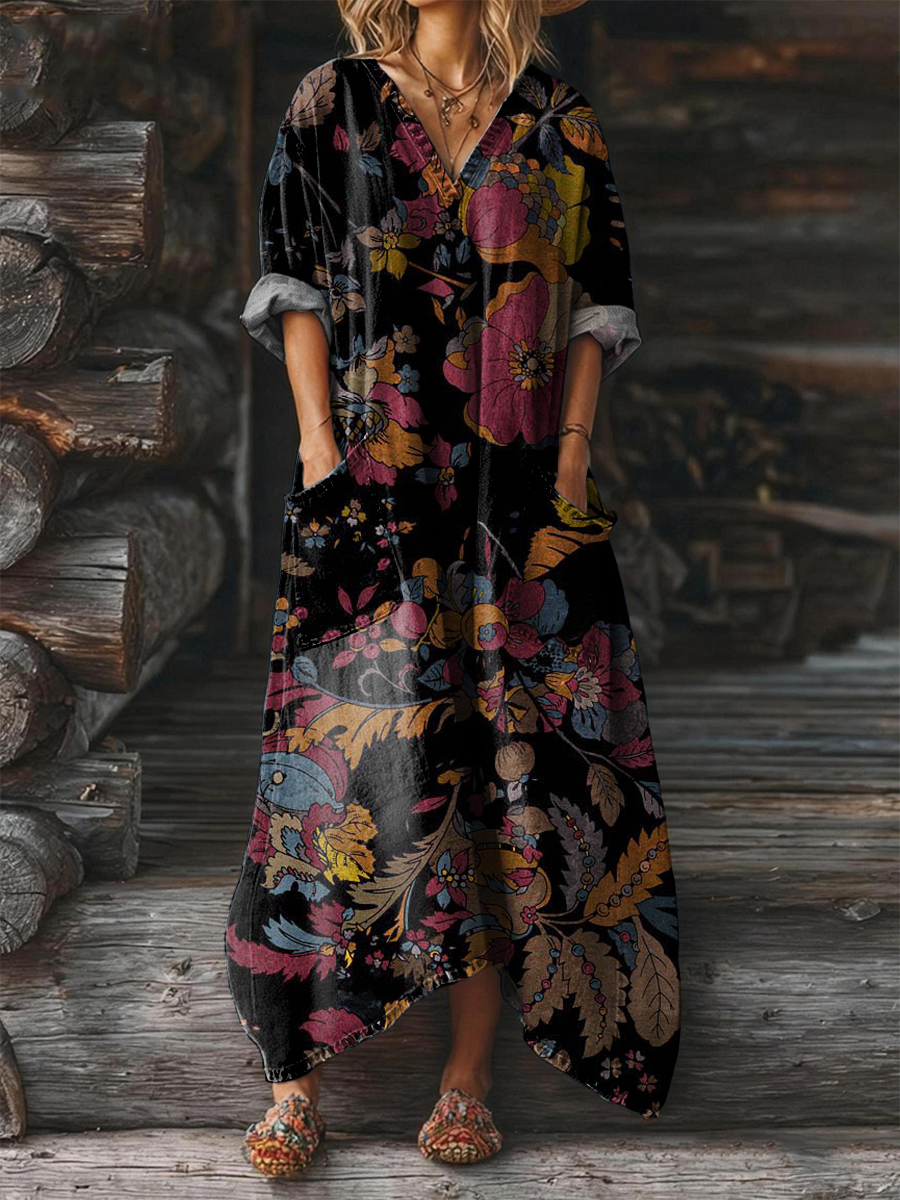 Women's Retro Ethnic Floral Art Print Casual V-Neck Washed Cotton Denim Dress