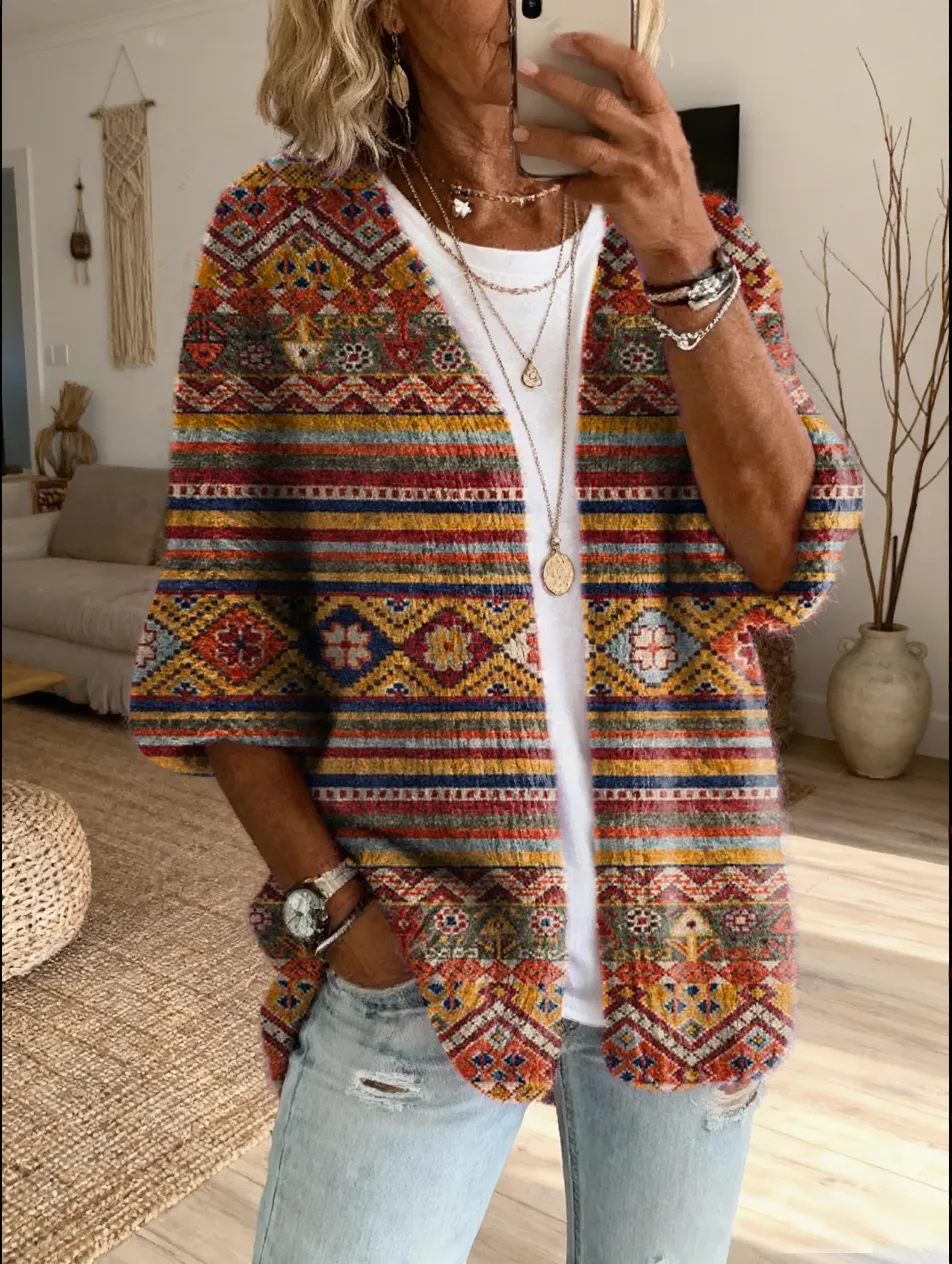 Women's Retro Ethnic Striped Art Print Casual Long-sleeve Wool Blend Knit Cardigan Sweater