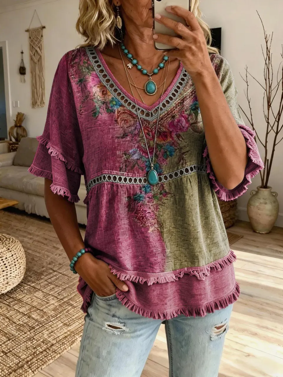 Women's Retro Patchwork Floral Art Print Casual V-Neck Cutout Top